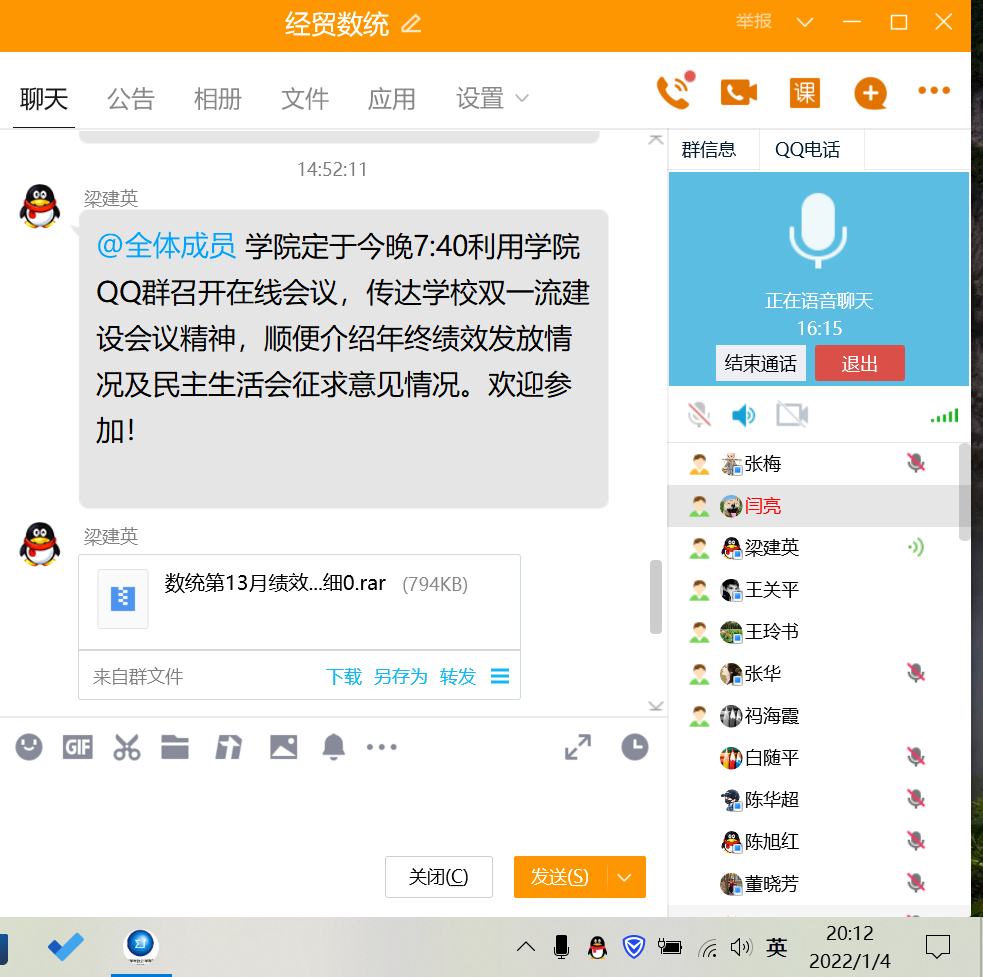 2022年1月4日,数统学院通过腾讯语音召开了 “双一流”建设工作推进研讨会,学院党委书记祃海霞、院长梁建英、党委委员耿会清、副院长王玲书、副院长闫亮出席,全体教职工参加。本次会议由梁建英院长主持召开。