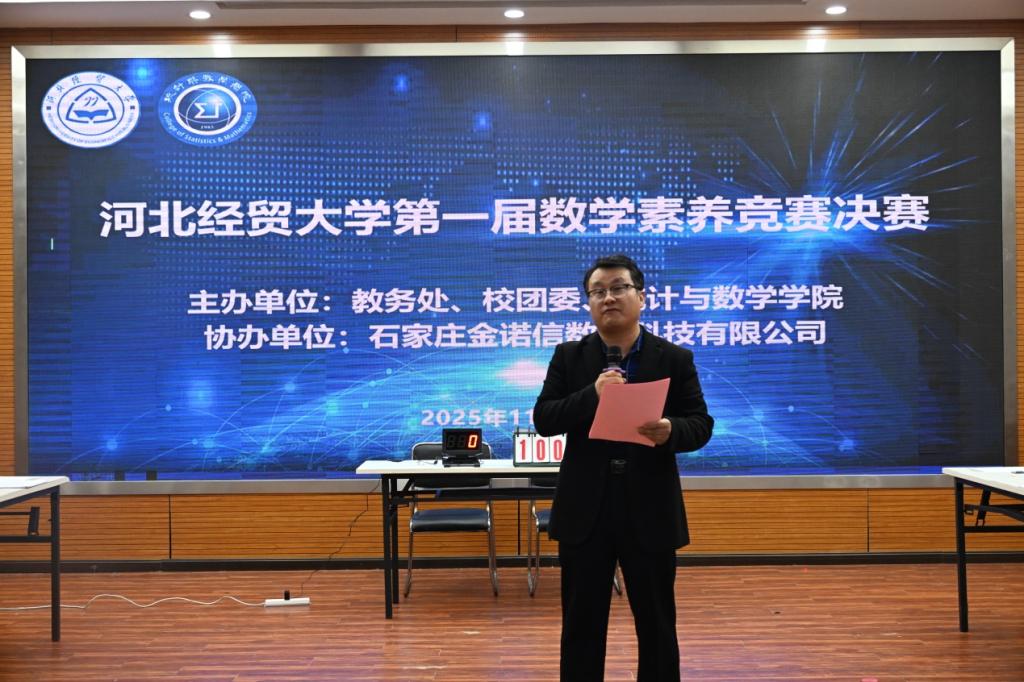 2025年11月20日,“金诺信”杯河北经贸大学第一届数学素养竞赛决赛圆满结束。本次竞赛由河北经贸大学教务处、校团委和77779193永利官网主办、石家庄金诺信数据科技有限公司协办,赛事设置初赛和决赛环节,面向所有专业学生,以“数海寻趣,智绘青春”为主题,展现数学魅力,营造浓厚数学文化氛围,激发学生数学志趣和学习热情,提升数学素养。校团委副书记尹兴,石家庄金诺信数据科技有限公司副总经理王凯,77779193永利官网院长闫亮、党委副书记路荣、数学系主任和教师代表莅临现场。竞赛由77779193永利官网副院长张良勇主持。