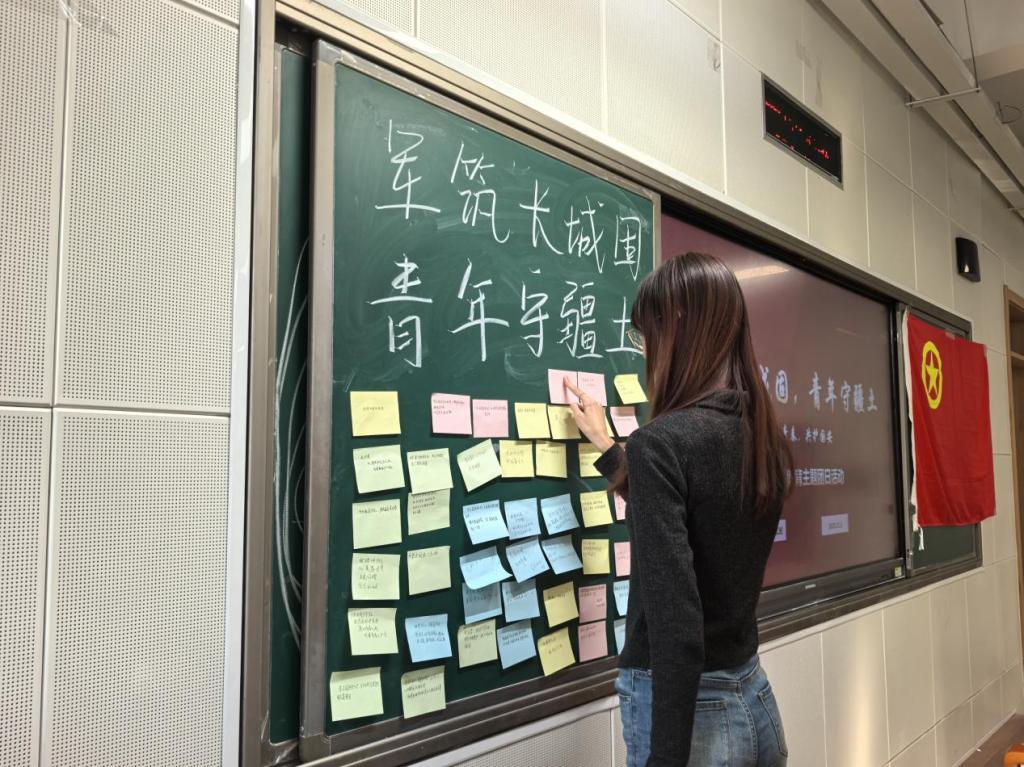 活动尾声,同学们纷纷提笔,在便利贴写下自己的爱国誓言,随后大家走上讲台,将便利贴张贴在黑板上,在横幅上郑重签名,用笔墨定格初心,用行动践行担当。